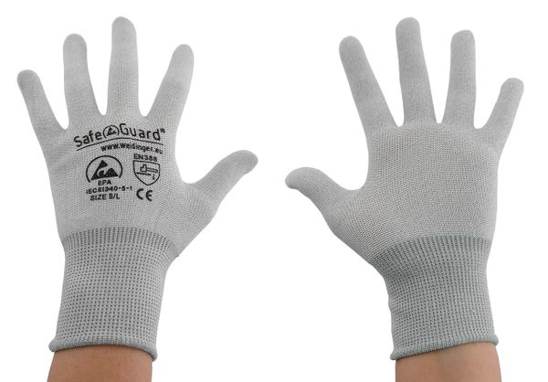 Artikelname: ESD-Handschuhe, mit Beschichtung BeschreibungDie ESD-Handschuhe mit PU-beschichteten Handflächen bieten einen herausragenden Schutz vor elektrostatischen Entladungen und gleichzeitig eine optimale Griffigkeit für präzise Arbeiten in anspruchsvollen Umgebungen. Diese Handschuhe sind darauf ausgerichtet, höchsten Tragekomfort, Effizienz und Sicherheit zu gewährleisten. Eigenschaften• ESD-Handschuhe, mit PU-Beschichtung• Angenehmes und komfortables Tragegefühl• Atmungsaktiv und nahtlos verarbeitet• Nicht waschbar• 100 % silikonfrei inkl. Verpackung• Jede Größe hat eine eigene Bündchenfarbe• Material: 80 % Nylon, 20 % Carbonfaser• Verpackungseinheit: 1 Paar Sonstige Hinweise• CE-Kennzeichnung, SafeGuard Logo, Prüfnummer, ESD Kennzeichnung auf dem Handrücken• Typischer Ableitwiderstand: 10⁷ – 10⁸ Ohm• Norm: DIN EN 61340-5-1 (Elektrostatik – Teil 5-1: Schutz von elektronischen Bauelementen gegen elektrostatische Phänomene – Allgemeine Anforderungen)• Norm: DIN EN 388 (Schutzhandschuhe gegen mechanische Risiken)